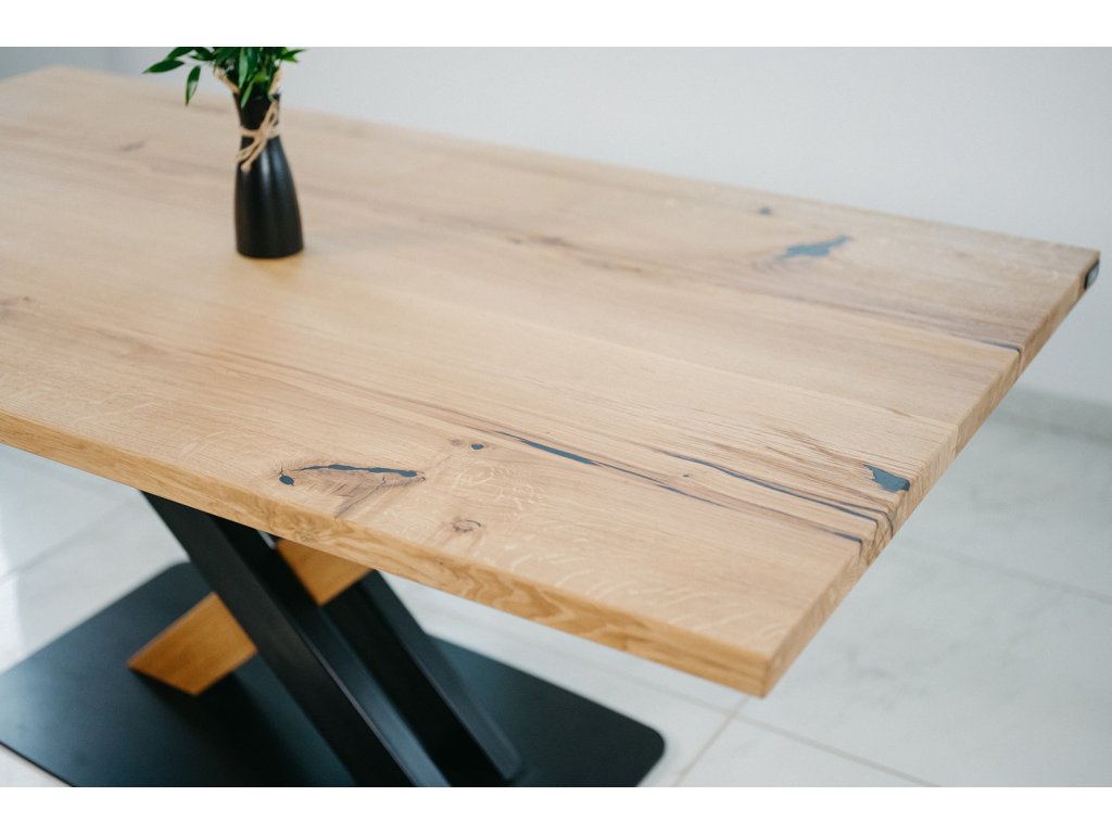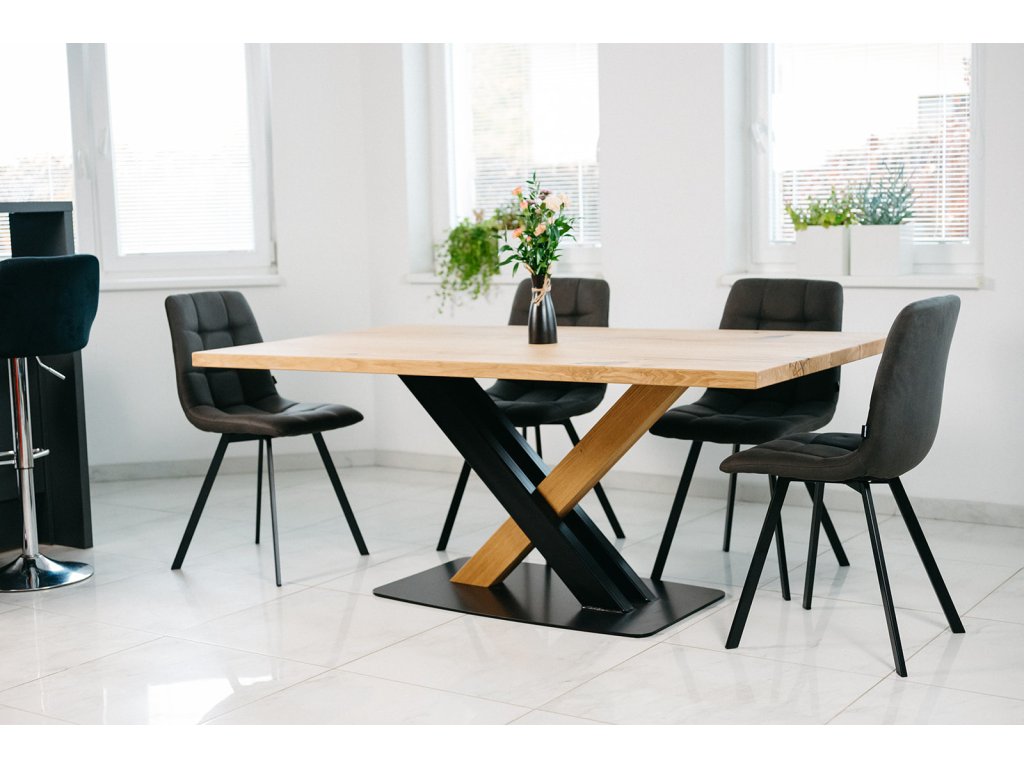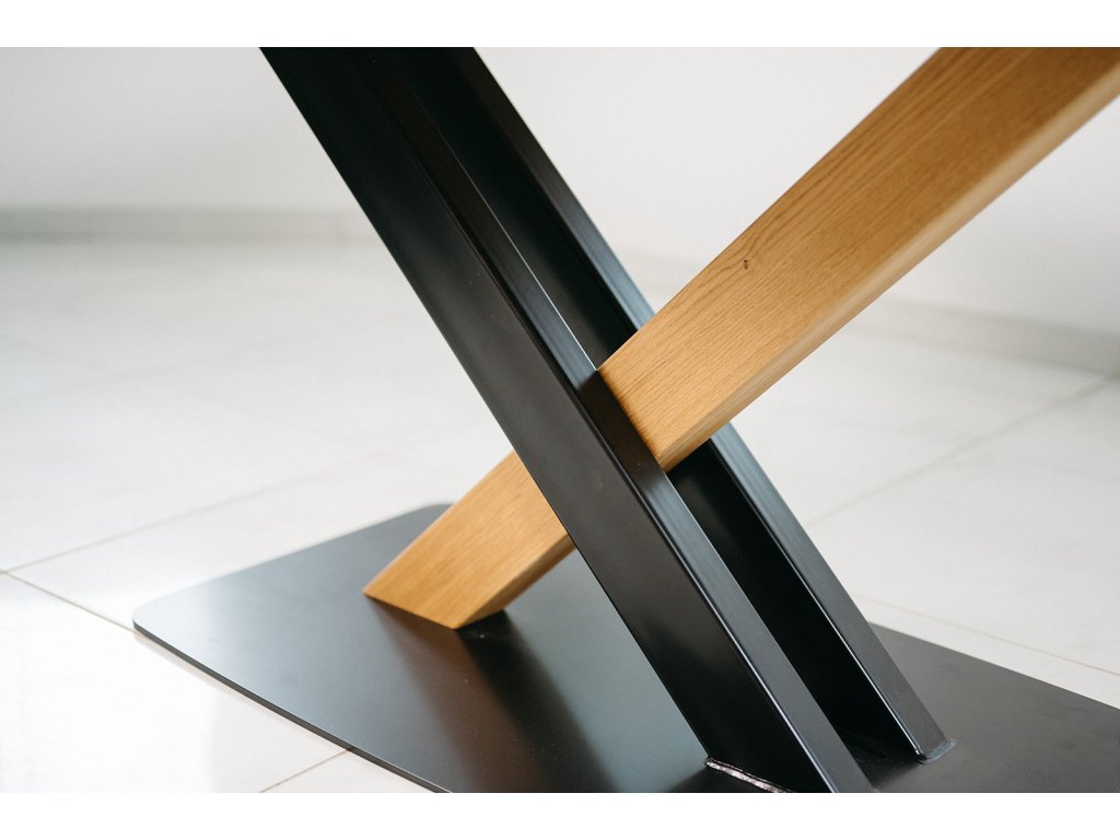 Centrální podnož ve tvaru X je vyrobena z ocelových profilů 100×50 mm v kombinaci se dřevem, které zajišťují stabilitu a odolnost stolu. Konstrukce umožňuje rovnoměrné rozložení hmotnosti a zároveň vytváří moderní, esteticky výrazný vzhled. Ke stolové desce se připevňuje pomocí závrtných matic, což umožňuje rychlou a jednoduchou montáž. Díky této konstrukci je spoj pevný, opakovaně rozebíratelný a bez rizika poškození. Povrch podnože je ošetřen kvalitní práškovou barvou – komaxitem, který vytváří odolný a rovnoměrný povrch.
